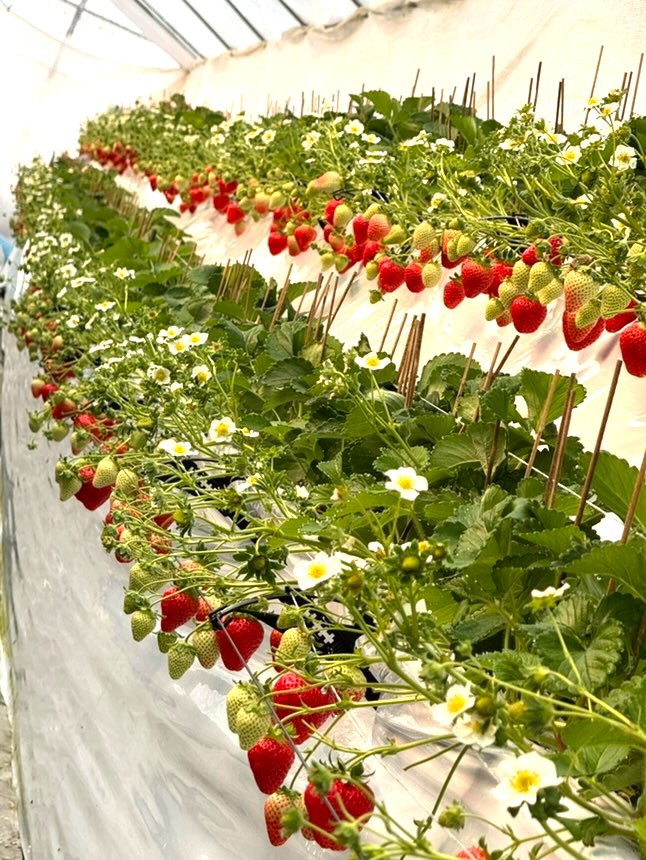 高設栽培で、立ったまま摘み取れます。その日もっとも食べごろのハウスへ案内してくれます。