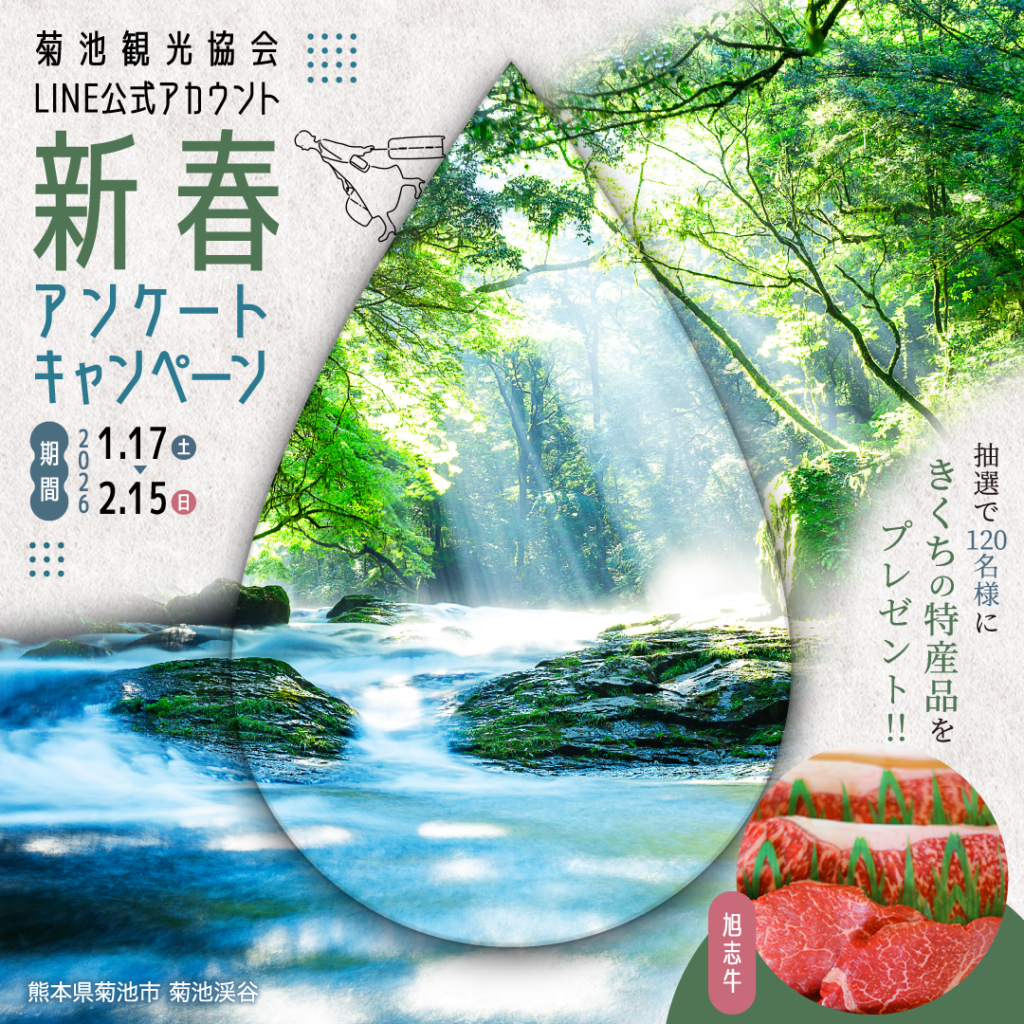 菊池観光協会公式LINEを友だち登録し、アンケートに答えると『菊池の特産品』が抽選で120名の方に当たります。