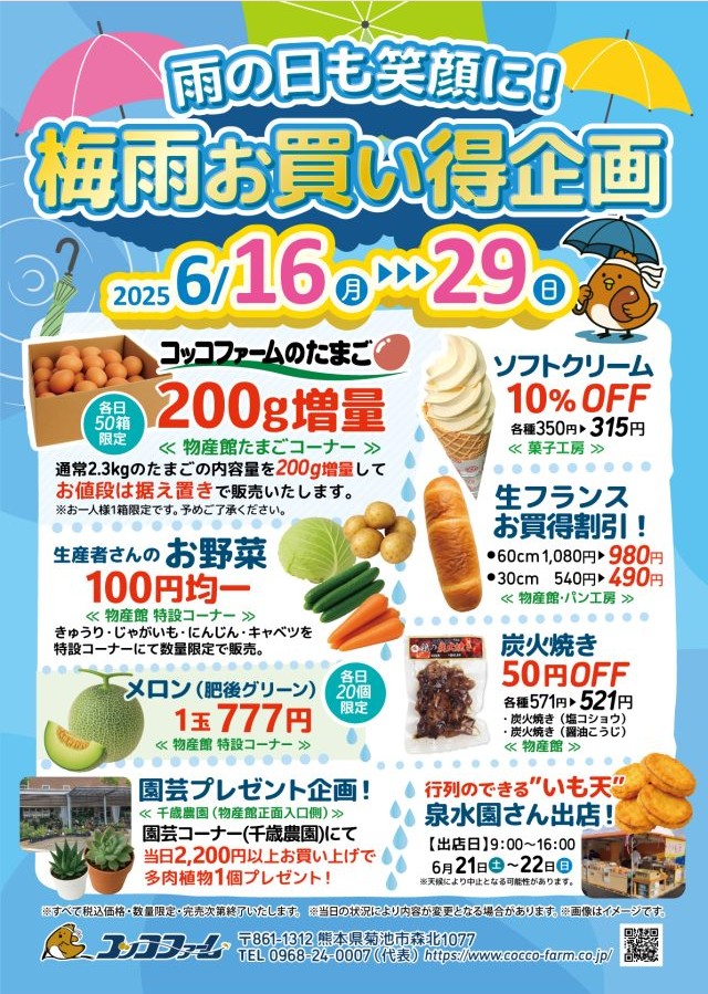6月16日よりコッコファームでは「梅雨お買得企画」を開催されています。 期間中は、お得が目白押し!梅雨が楽しくなるイベントです。