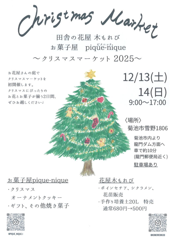 お花屋の「木もれび」さんのお庭でクリスマスマーケットが開催されます。 お花とお菓子が揃った2日間をぜひお楽しみください。