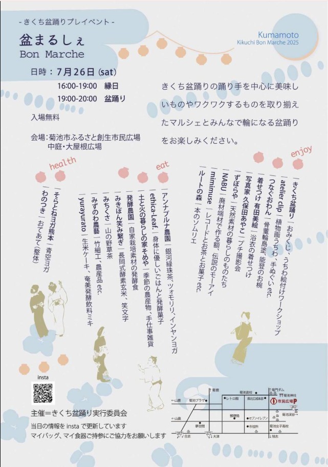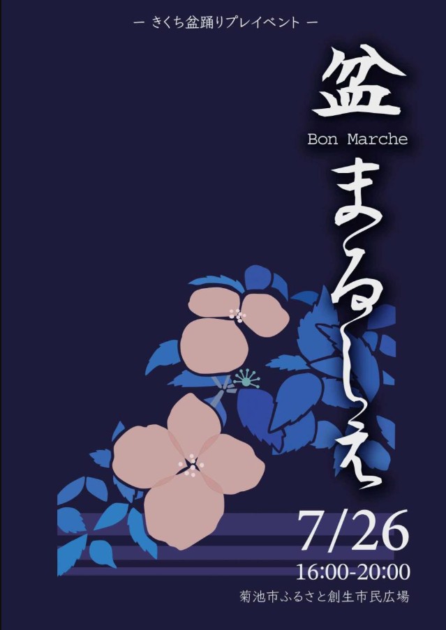 きくち盆踊りのプレイベント「盆まるしぇ」が7月26日に開催されます。 きくち盆踊りの踊り手を中心に、美味しいものやワクワクするものを取りそろえたマルシェとみんなで輪になる盆踊りをお楽しみください。