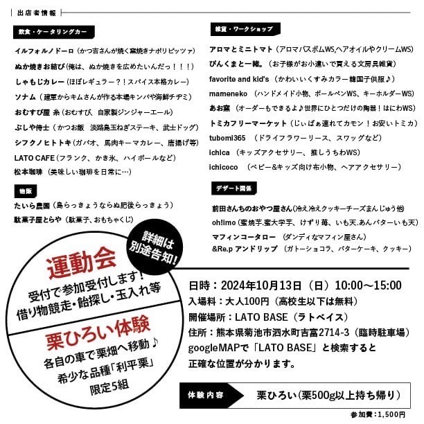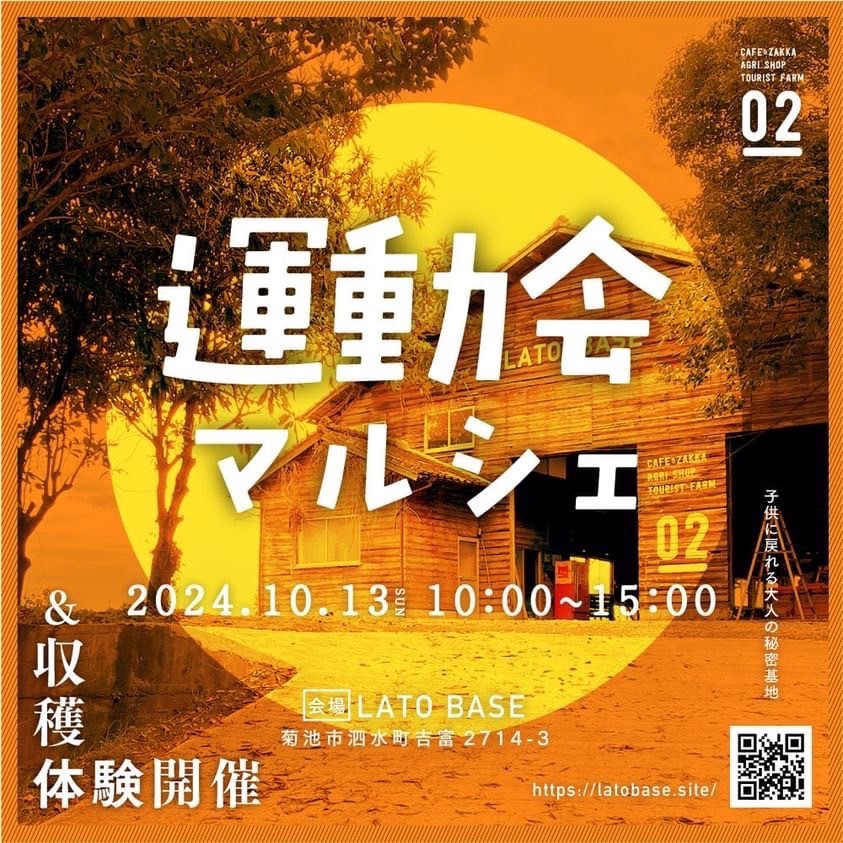 【日時】2024年10月13日(日) 10:00~15:00 【会場】菊池市泗水町 LATO BASE