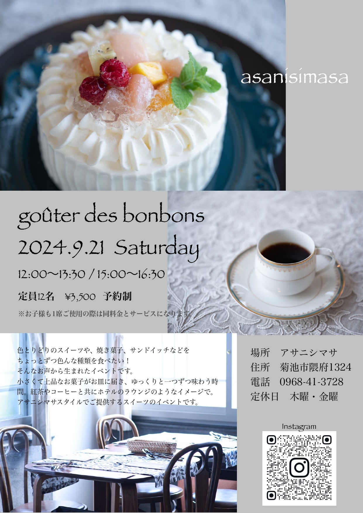 Café ASANISHIMASA にて魅惑的なスイーツイベント開催です°˖✧ 【日時】2024年9月21日(土) 12:00~13:30 / 15:00~16:30 【場所】Café ASANISHIMASA 菊池市隈府1324 【料金】3,500円 予約制(お子様も1席ご使用の際は同料金とサービスになります) 【電話】0968-41-3728