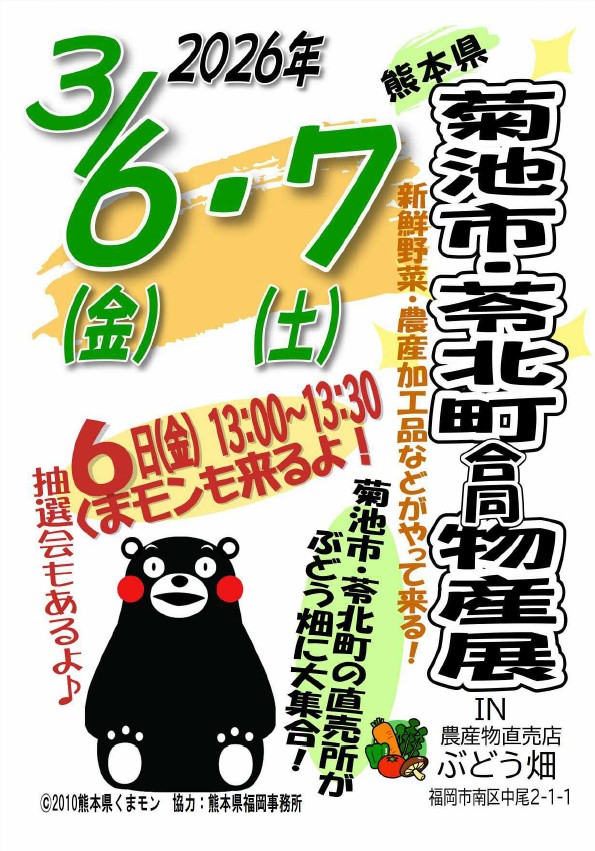 熊本県の苓北町と菊池市合同の物産展が開催されます。 新鮮野菜や農産加工品の販売の他、抽選会も行われます。 また3月6日(金)13:00~13:30には「くまモン」もやってきます。